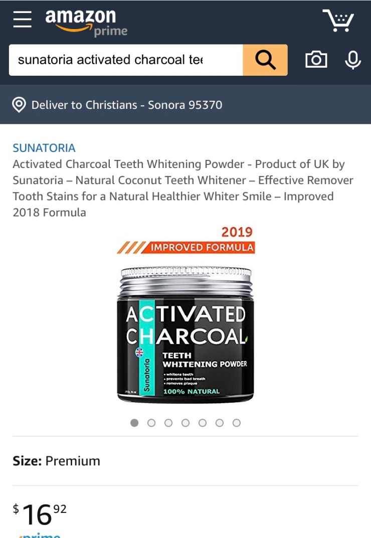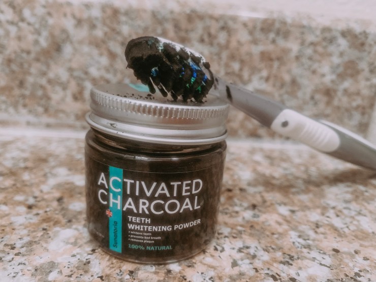 I decided to hop on the bandwagon and try a charcoal teething whitener paste. As a few of you may know activated charcoal has many benefits from helping aid in weightloss, detoxing, heart heath, and GI track heath. I have tried charcoal lemonades and honestly been a huge fan of them so why not give it a shot with my teeth! I ordered the Sunatoria Activated Charcoal Teeth Whitening Powder off of Amazon for $16.92 which is affordable compared to other charcoal paste brands but also not a super cheap option if you are like us and budget. It comes in 2 oz container and is all natural, which is a huge plus for me.