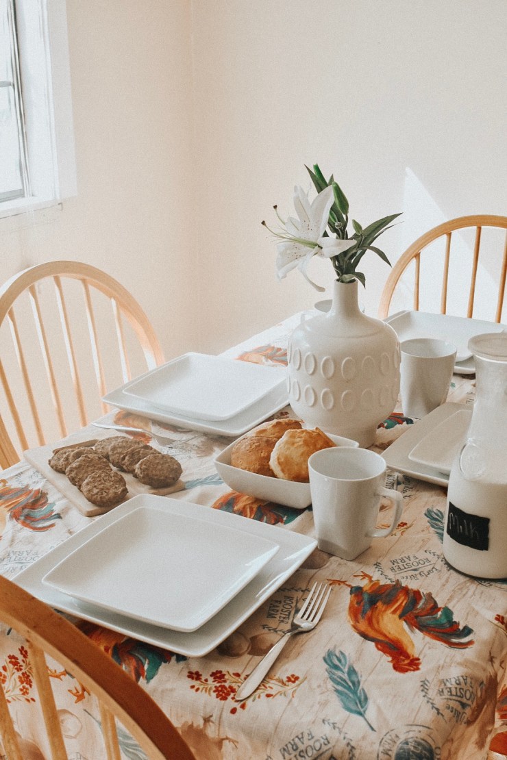 Our next buy was our first ever plate set and a few fun extras like the adorable milk jug with chalk writing. We scored our plate set, extra additions, and silverware for under $50 at Walmart due to some good sales going on. We loved the sleek design on the plates and stuck with our farmhouse theme while picking out the butter dishes, milk jug, and serving platters.