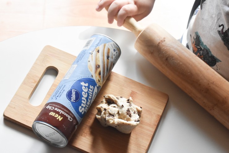 We began with two tubes of Pillsbury Sweet Biscuits and rolled two biscuits each into balls. Then we grabbed the rolling pin and rolled them out. When I cook or bake with the kids, they love helping out. I normally set some of whatever we are making to the side which is theirs to “cook” and play with. I gave Macyn two biscuits at his table to roll himself and have fun with. This makes this a great activity for fine motor skills, hand-eye coordination, cooking skills, and just overall fun.