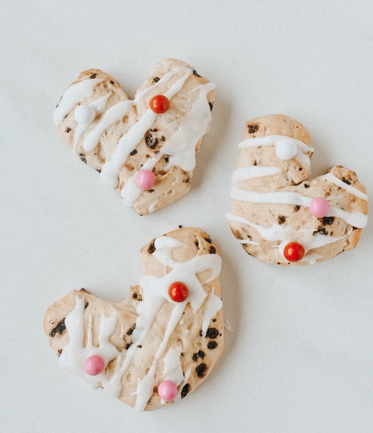 Every holiday brings new fun ideas in the kitchen and the other day it was just Macyn and I home so we decided to bake a fun Valentine’s Day treat! We looked around in the kitchen and even though he wanted to make cookies, we decided to bake sweet chocolate chip biscuits. To make them more Valentine’s Day like, we cut them into hearts and added some red, pink, and white Valentine’s Day candies. Although you can easily make these homemade as it is just a sweet biscuit, I happened to have some of the Pillsburry Sweet Biscuit tubes in the fridge so we used those. This is a super easy yet fun activity with kids this Valentines. Plus they turned out delicious!