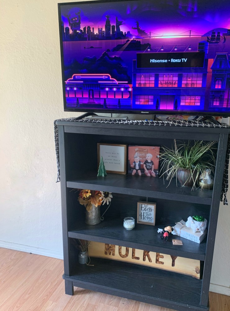 I was able to score this black entertainment center at Walmart for only $70. We originally wanted to mount the TV but we weren’t able to with the mount we bought so we kept that for our bedroom. Some of these pieces we already had and then some pieces are new. All together, they brought the entire wall together. I couldn’t be more happy with the end result! I love all things farmhouse so we went for a modern farmhouse style that is perfect for our house.
