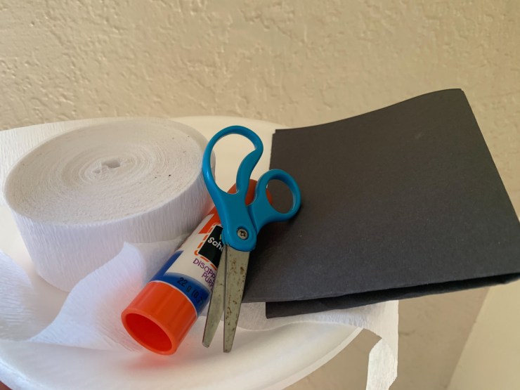 Step one: Using the black construction paper and scissors, cut out the ghosts eyes and mouth. Cut the paper into fun shapes to make it look like the ghosts mouth is open saying “booooo”. Then use your white construction paper to cut two small white oval for the eyes and two arms. Grab your glue stick and glue them in place. Make sure to glue the white hands behind the plate while glueing the rest to the front.