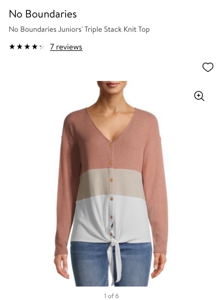 I have loved watching No Boundaries evolve over the years into affordable, cute styles. This triple stack knit long sleeve comes in a couple different colors. I have two and it is so comfy goes great with so much. It also ranges from XS to 3Xl which I love. Prices vary since it is included in Walmart’s winter clearance, but I found it for $10.96.