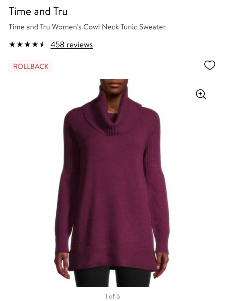 This cowl neck tunic sweater comes in so many different colors and has a very soft material. I sized up and love to wear it as a sweater dress with black leggings and booties. It is only $7 in most stores.