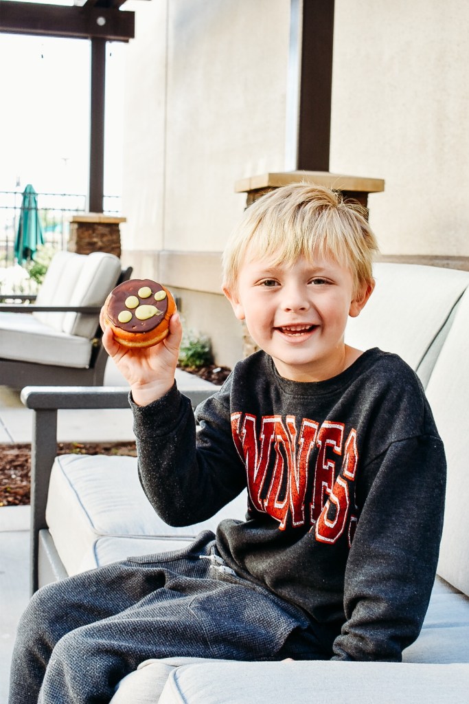 In the morning, we got ready real quick and went to grab a yummy donut from Dunkin’ Donuts located on the main floor. They had some fun themed donuts that the kids absolutely loved. We enjoyed breakfast outside in the lounge area before strolling around the grassy field.