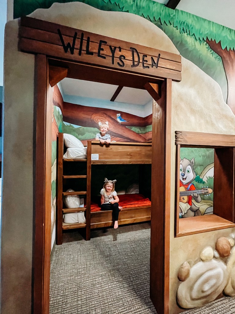 We arrived a little bit after 3 in the afternoon and went to check-in first. You can now check in on your mobile app too! The kids enjoyed playing some spring games while I was checking in. After we went up to our suite and got changed. This trip we were booked into the Wolf Den Suite and it was perfect for our stay. The kids loved the bunk beds in their own area. Our view from our room was beautiful too!