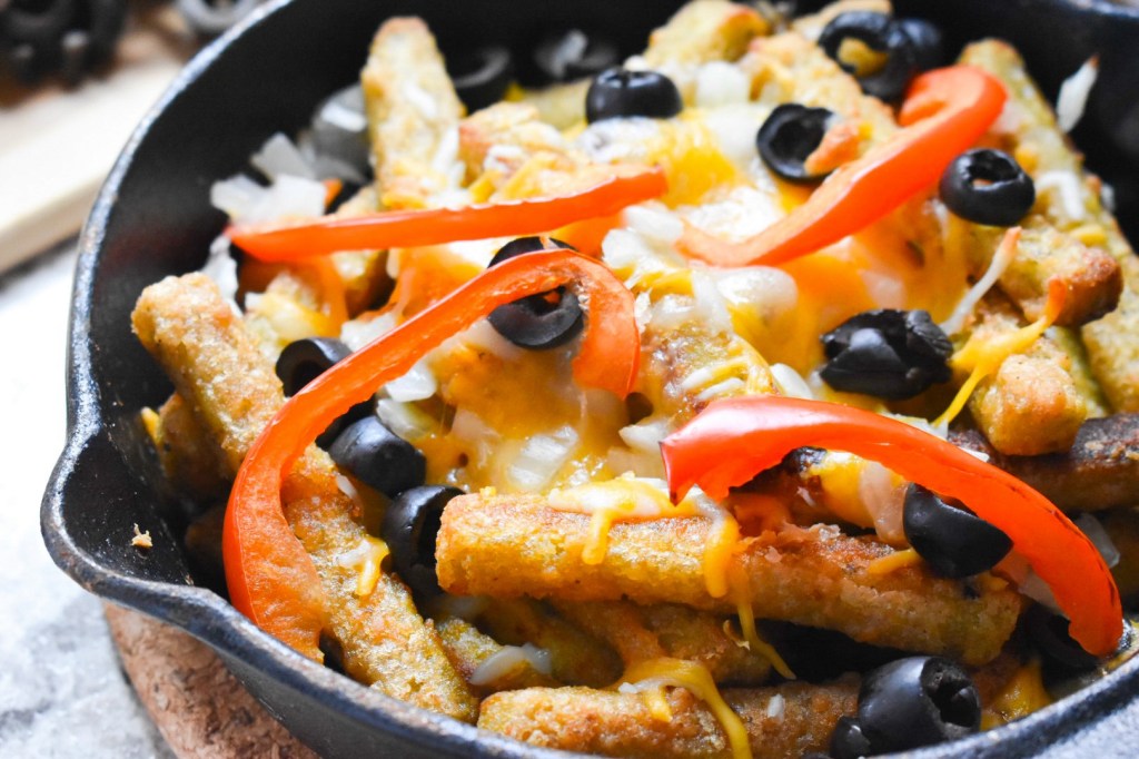Elevate your snack game with these Veggie Fries Nachos! Loaded with cheesy goodness, fresh bell peppers, and olives, baked to perfection in a cast iron pan. These Veggie Fries Nachos are an absolute delight and a family favorite! Plus, they’re easy to make and a guilt-free indulgence.